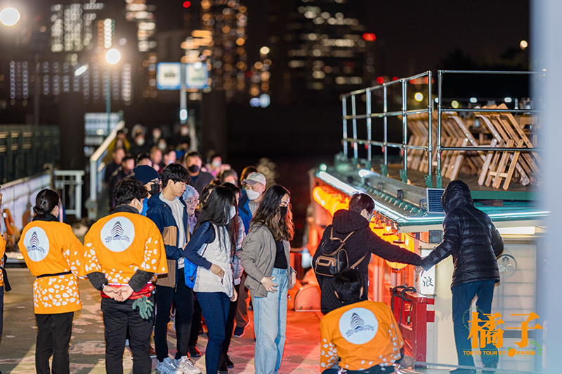 ランタンの灯るスカイデッキから眺めるお台場の景色は、海上ならではのものです。当屋形船自慢の演奏家たちが繰り広げる渾身の三味線パフォーマンスは、国内外問わず、乗客の皆さまを虜にしてきています。